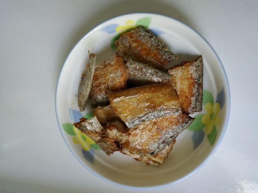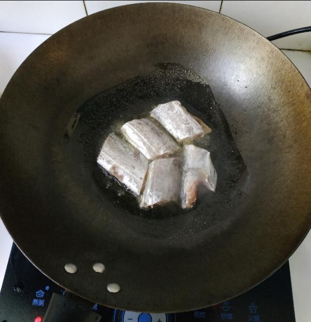 3:油烧热,改最小火,放进带鱼,一次放四五块左右。小火煎炸,不要翻动。