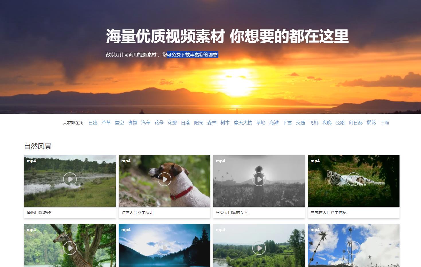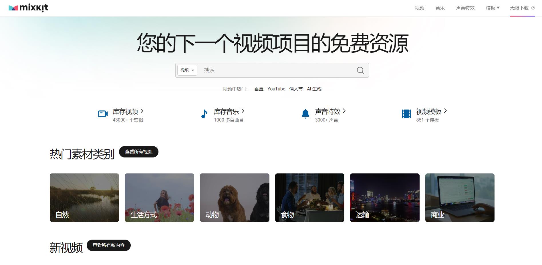 Mixkit是一个可以免费商用的高质量视频素材网站,视频风格涵盖了:商业、科技、城市、动画、乐器、自然、户外、风景、食物等等领域,除了视频素材外,Mixkit上还有音乐、音效、视频模板素材,也都可以免费无限制下载、