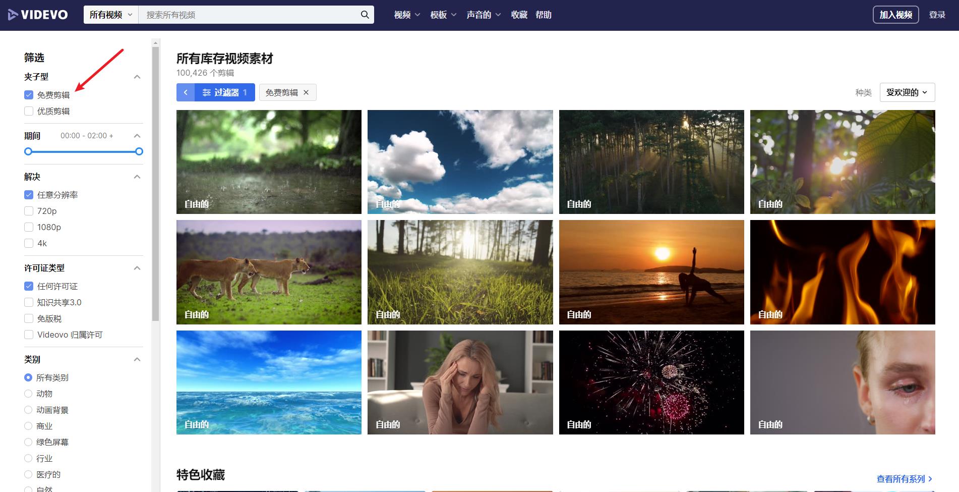 Videvo是一个拥有大量免费视频素材片段的网站,类型涵盖了文化、城市、健康、科学、空间、技术、娱乐、抽象的、运动的、绿色屏幕、视觉特效、动画背景等众多细分领域,使用该网站时,可以先在所有视频的筛选器中,只勾选免费剪辑,这样展示出来的就全部是免费视频素材了。需要注意的是,此网站部分素材商用需要注明原作者,一定要看清楚。