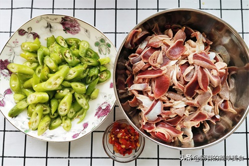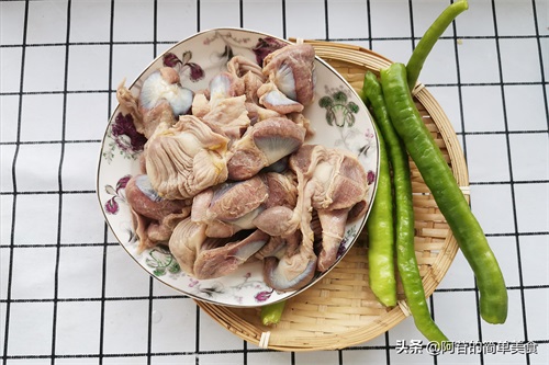所需材料:鸡郡肝,辣椒,泡姜,泡椒,生抽,淀粉,食用油,蚝油,食盐,鸡精