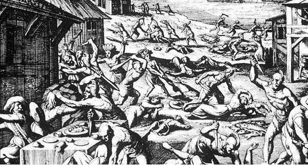 为了震慑印第安人,哥伦布不仅下令斩首印第安人领袖,还公开割下当地人的耳朵。仅在海地岛,哥伦布就抓捕了1000多名当地人,600人留在当地当西班牙人的奴隶,500人被送到西班牙当奴隶。这500人中,200人在海上丧生,然后被西班牙殖民者扔进了大西洋。