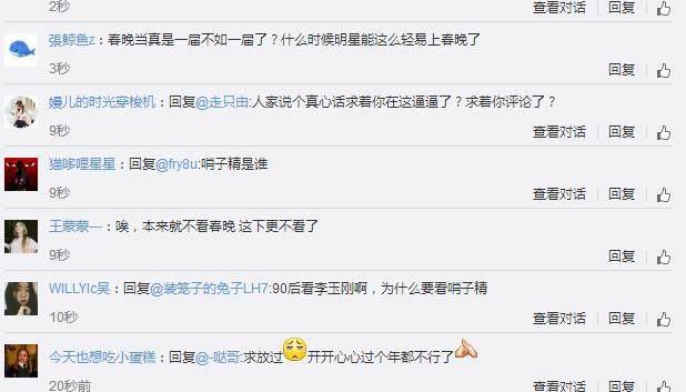 而有些不支持的网友却表示:“春晚一届不如一届”,“唉,本来就不看春晚 这下更不看了”,“求放过,开开心心过个年都不行了”等批评留言。
