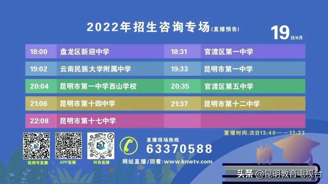 电视频道直播的同时,昆明教育电视台官方网站、手机APP、微信视频号、抖音和微博也将同步直播。直播期间您可以通过网络直播间发言或拨打热线电话0871-63370588咨询报考问题,学校校长和招生老师将亲自解答您的问题。