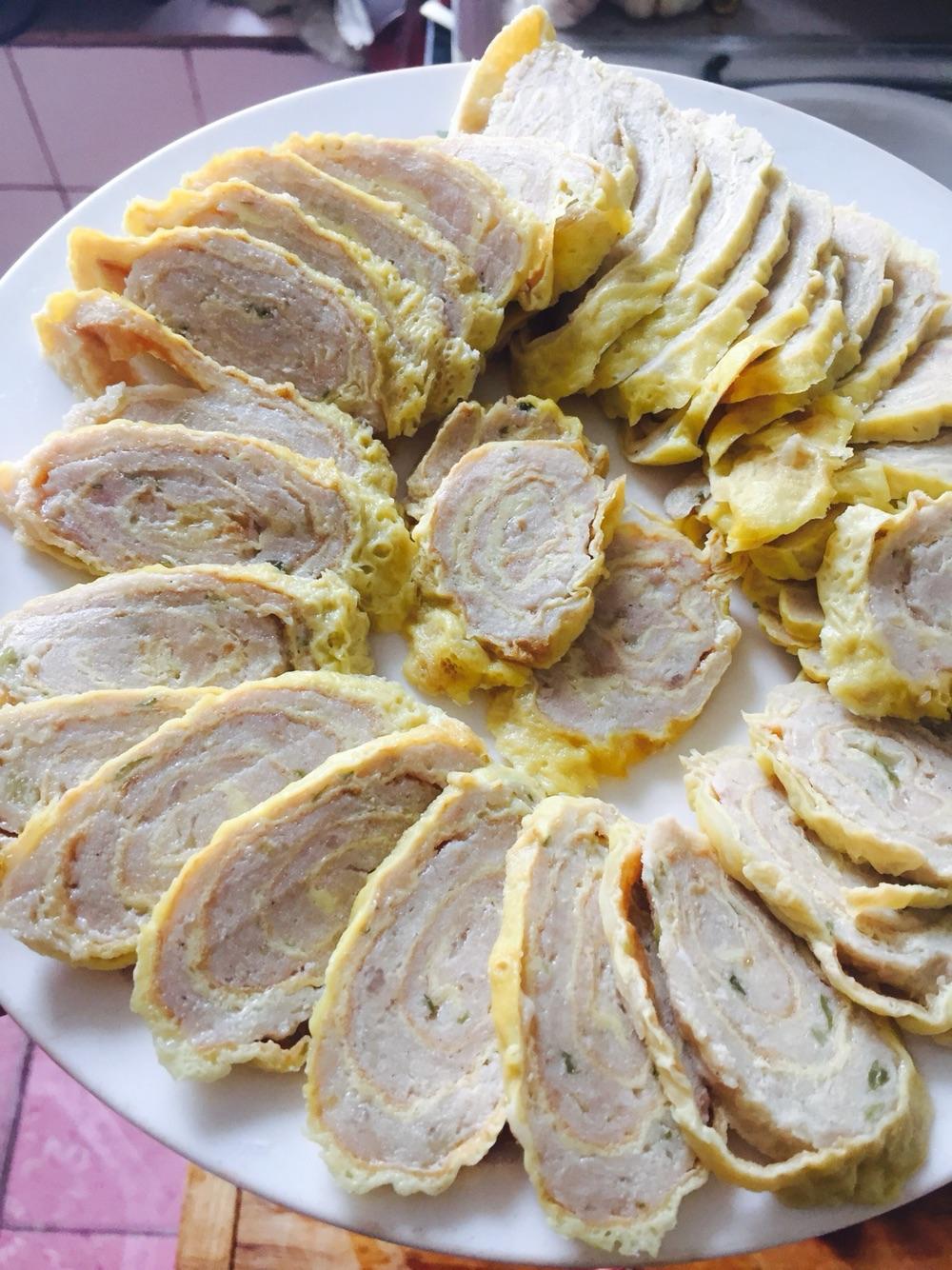 6.包好的卷尖排在一起,上面压上干净的重物,放凉后切片摆盘