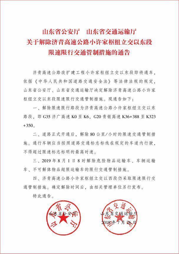 济青北线正式通车,解除80公里/小时限速交通管制措施