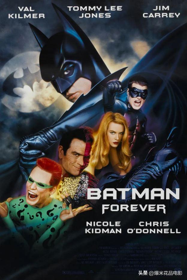 《永远的蝙蝠侠》将导演蒂姆·波顿换成了乔·舒马赫,将基顿换成了方·基默,并以装饰美学的方式将一种全新的可卡因狂欢引入了哥谭市。尽管影片的色调令人震撼,严格来说,《永远的蝙蝠侠》确实发生在《蝙蝠侠归来》之后不久,在蝙蝠侠的真人反派库中加入了谜语人(金·凯瑞 饰)和双面人(汤米·李·琼斯 饰)。这部电影的另一个关键角色就是蝙蝠侠助手迪克·格雷森(克里斯·奥唐纳 饰)的首次亮相,也就是罗宾。