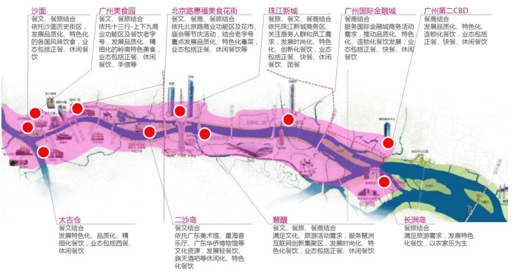 广州未来一江两岸国际美食长廊示意图。其中,广州老字号或将聚集在西关美食带。图片来源:《广州市餐饮业网点空间布局专项规划》