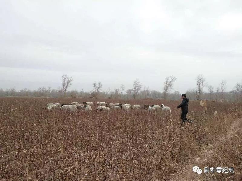 早餐后,冒着严寒,我和同事们一起动手帮艾合买提把院落打扫一番,把旧物清理干净,杂物整理好。得知艾合买提最近在外打零工,家里的扶贫羊好几天没活动了,我们就主动担任起了“羊倌儿”的职责,还把左邻右舍的羊都一起放了。孔雀河已冰封,村里的景色呈现出别样的风采,赶着羊群走过一片片的棉杆地,白影点点的羊群在褐色的棉杆中格外显眼,我、同事们还有艾合买提大哥有说有笑甩着鞭子,一边照看着撒欢的羊群,一边顺手捡拾棉田的清田花,“结亲周”的第一天,惬意而快乐。