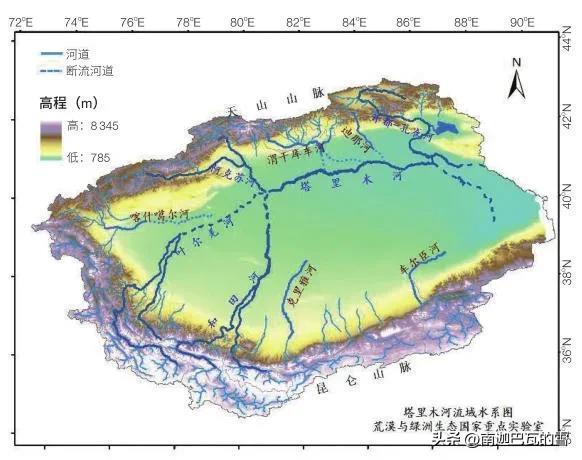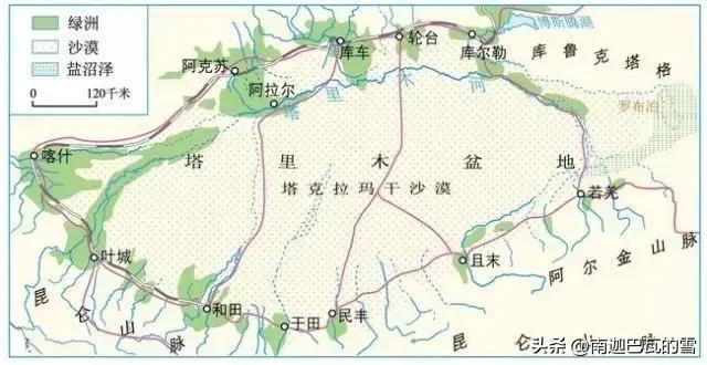 塔里木河的水源来自塔里木盆地两侧的天山和昆仑山和喀喇昆仑山的冰雪融水,这3座巨大的山脉拦截了来自海洋的水汽,塔里木河的支流阿克苏河发源于天山,叶尔羌河发源于帕米尔高源的喀喇昆仑山,和田河发源自昆仑山脉。也正是因为它们的存在,面积高达33万平方公里的塔里木盆地并未成为不毛之地,相反这些河流在塔克拉玛干沙漠的边缘冲涮出了一块又一块的绿洲,也就是这些沙漠中的绿洲养活了南疆800多万的人口,约占全自治区的40%。使得南疆成为了物产富饶瓜果飘香的福地,得益于昼夜温差大和充足的光照,这里的瓜果品质上乘含糖量高。而且在看似荒芜的塔克拉玛干沙漠下面含有丰富的油气资源,乃是我国西气东输重要的源头。