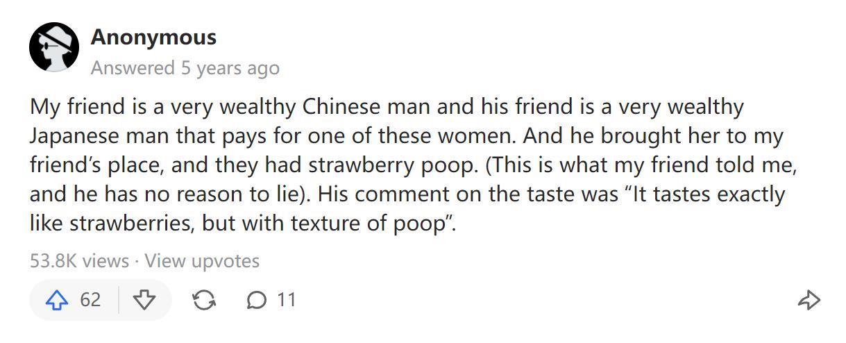 还有网友说:他认识一个非常有钱的日本人,而这个日本人曾经带了一个女人到网友家里,只为吃到女人的草莓便便,而且这个日本人还说味道很好。