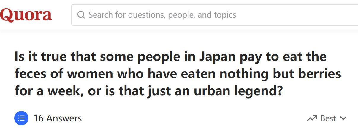 例如,美国版知乎上有这样一个问题:日本有人花钱吃女性的粪便,并且要求她们提前一周只吃水果,这是都市传说还是真的。