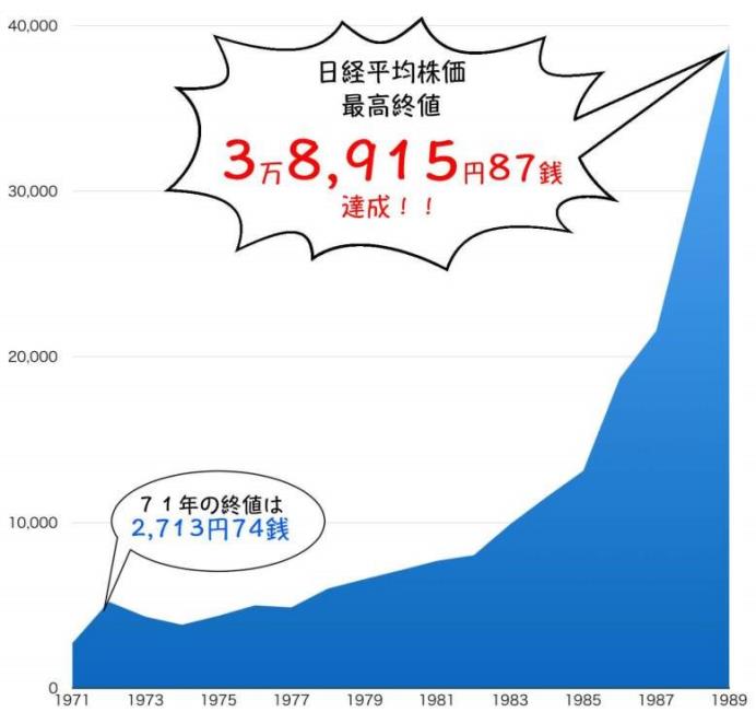 1989年,东京证券交易所的道琼斯工业平均指数达到38915日元,是71年的14倍。