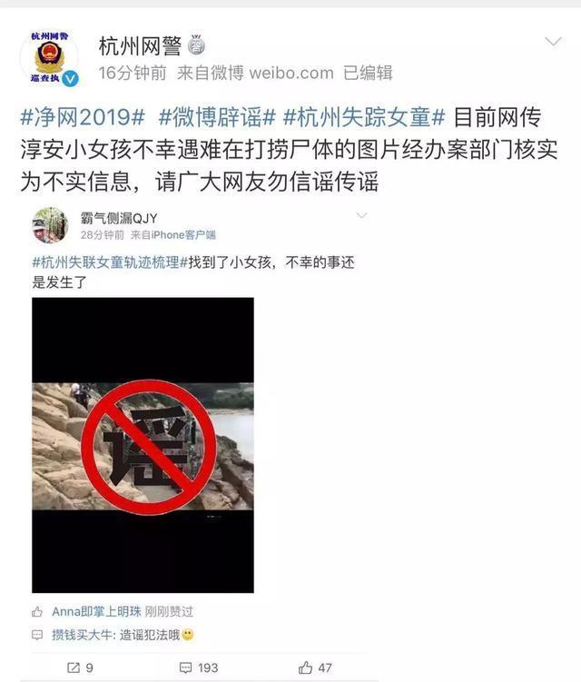 刚刚,@杭州网警 也辟谣:目前网传淳安小女孩不幸遇难在打捞遗体的图片经办案部门核实为不实信息,请广大网友勿信谣传谣!