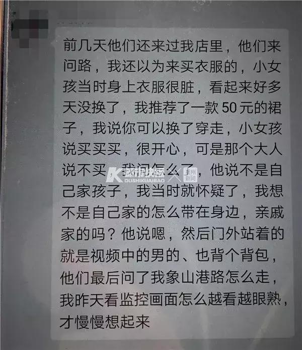 后来店员推荐了一件50元的衣服给女孩,女孩还很开心,但问了价钱50元,租客说不买。店主很奇怪,这么便宜为什么也不买?后来这对大人说女孩不是自己的小孩,是亲戚家的孩子。店主看到新闻后曾反复比对男租客穿着样貌,很肯定就是这个他。