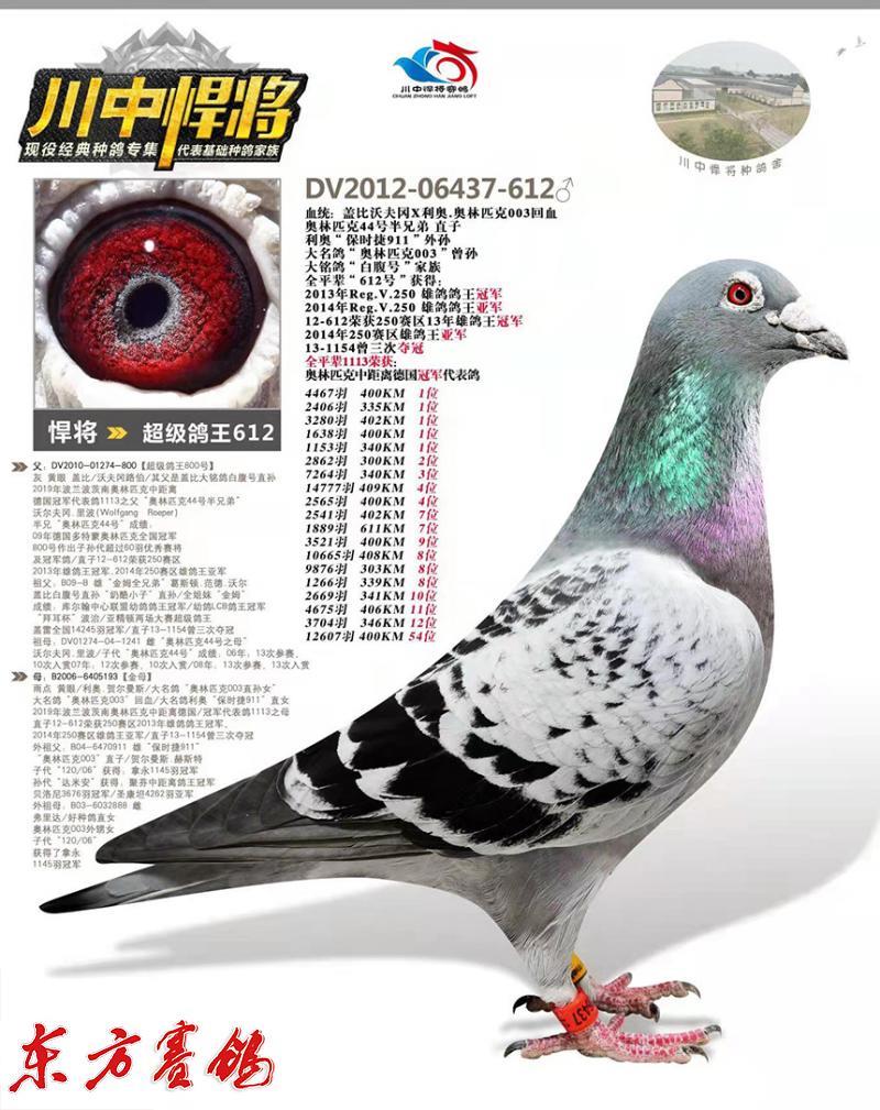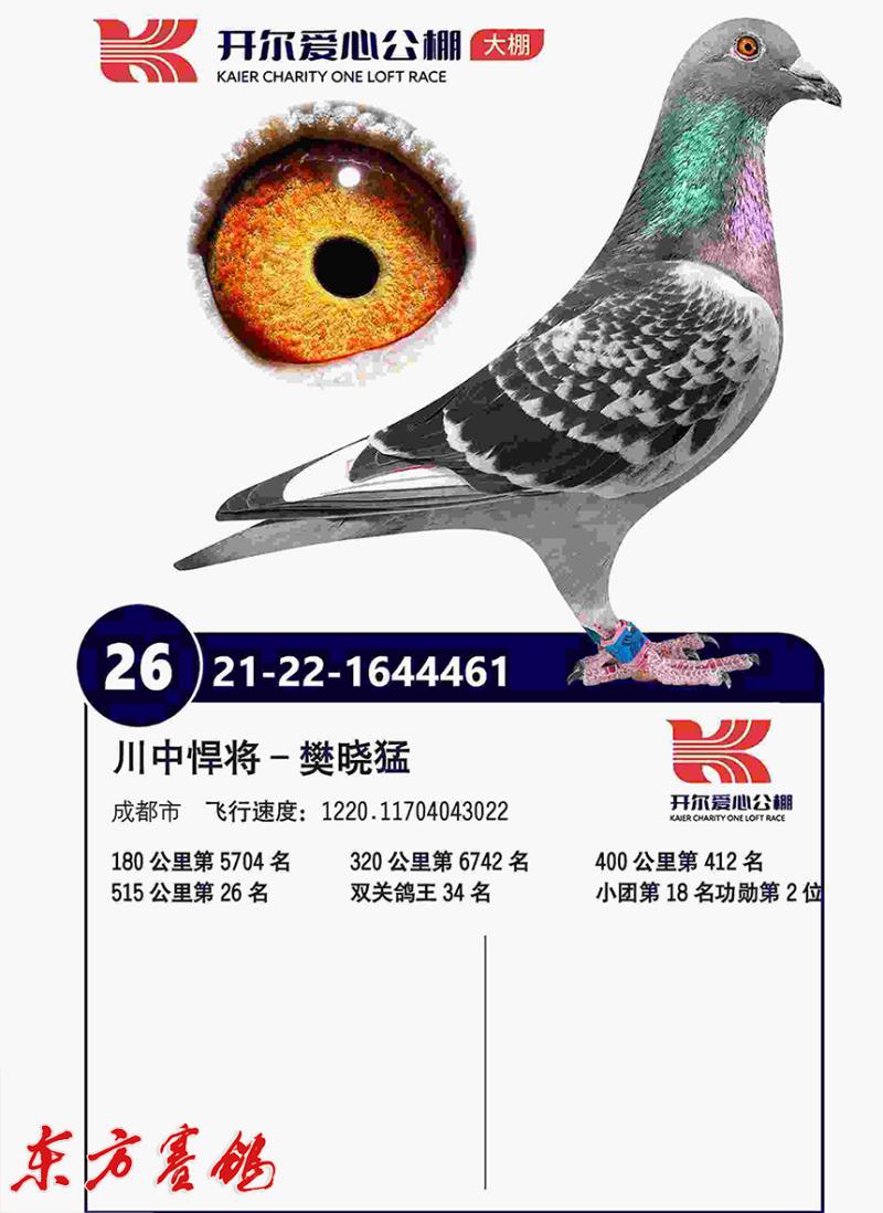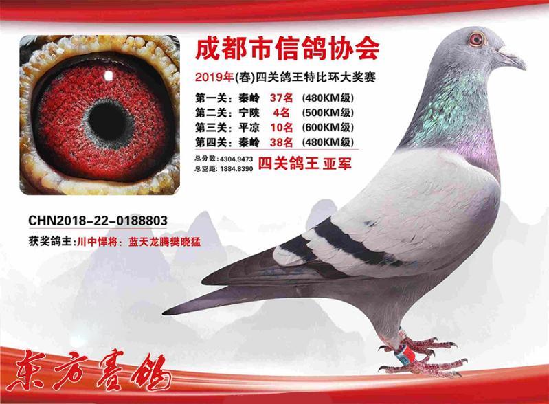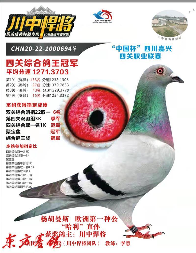 2021年5月7日在四川嘉兴国际赛鸽俱乐部第四关比赛落幕之际,川中悍将樊晓猛的环号694战将,四关出色稳定发挥,凭借四关133名、27名、13名、15名的成绩、以1271.3703的平均分速,登顶四关综合鸽王冠军,同时还荣获了18、30、45、50、51等四关综合鸽王。