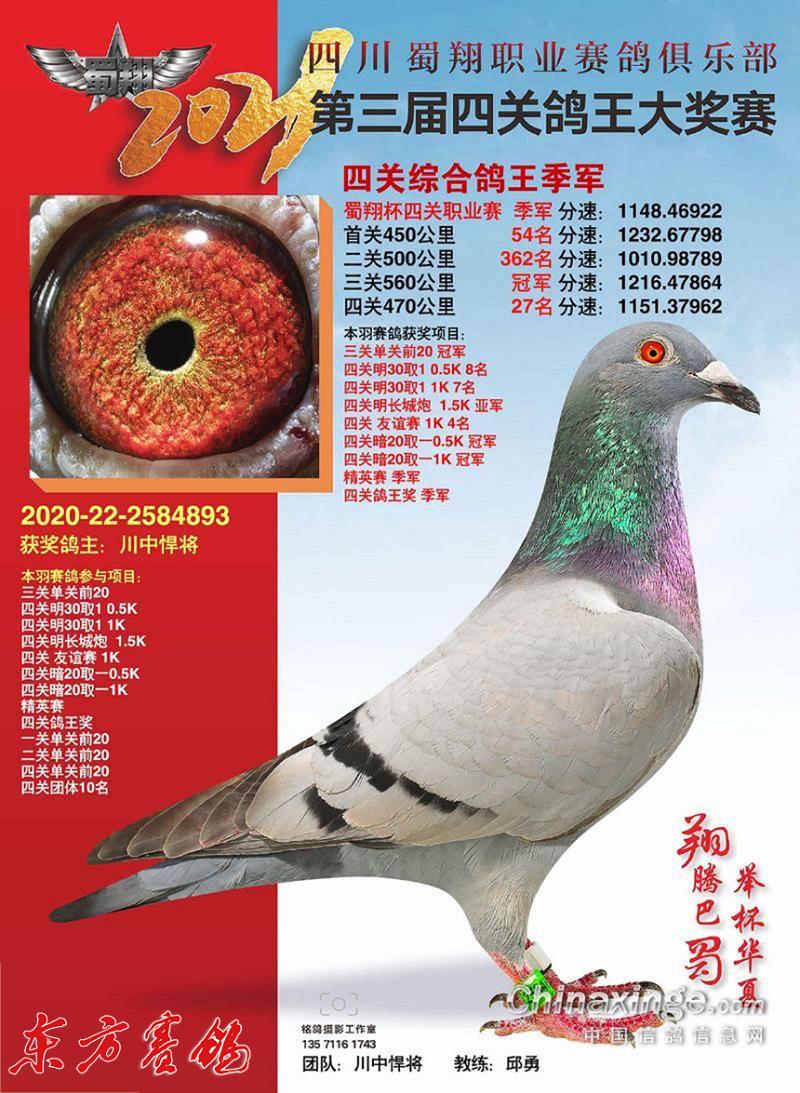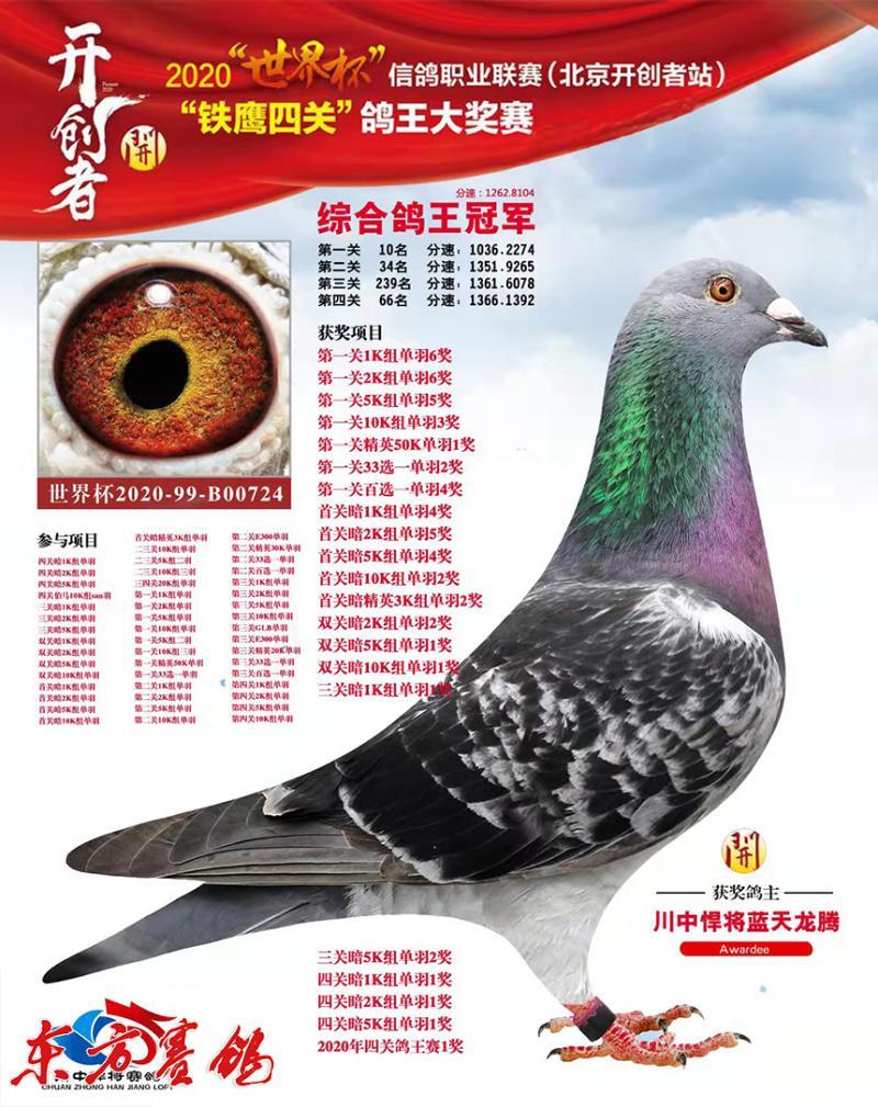 2021年春荣获四川蜀翔职业赛鸽俱乐部四关鸽王综合季军、17、47、98名等23羽综合鸽王,获得场内最高豪奖,还是第三关560公里最远程的冠军。