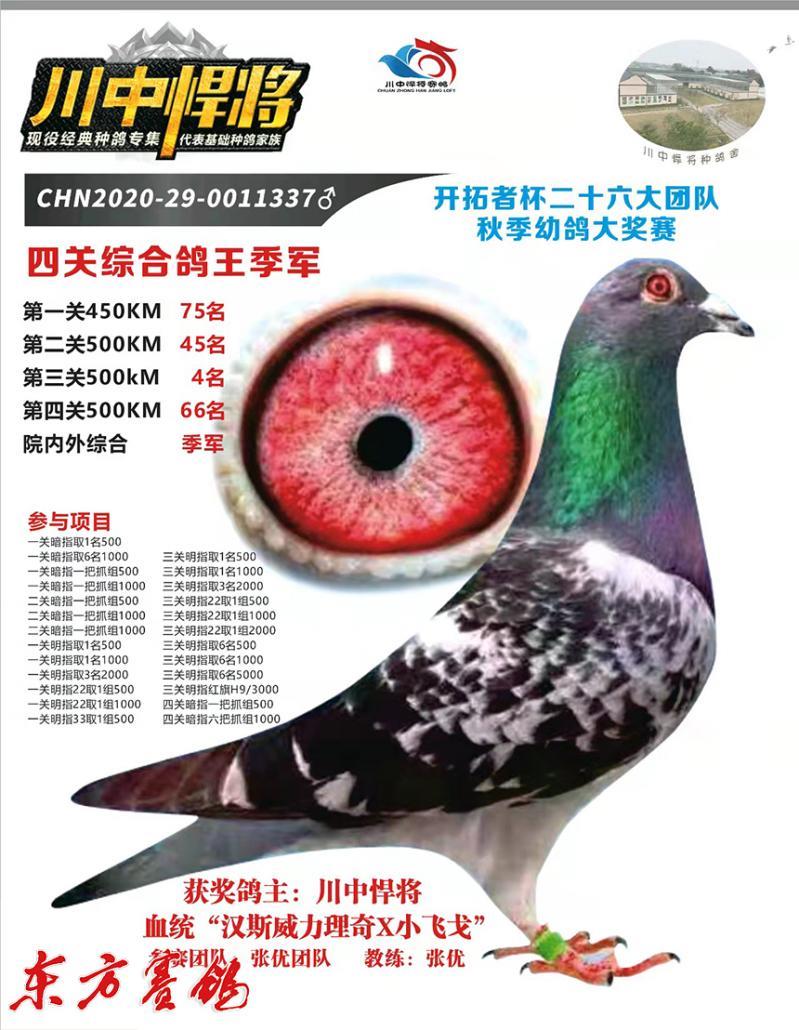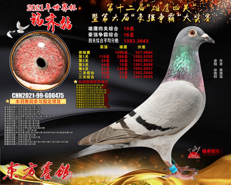 2021年秋荣获北京百鸽园“中国杯”四关综合鸽王17名,院内12名;第一关 500公里41名、第二关 550公里 24名、第三关500公里16名单关高位。