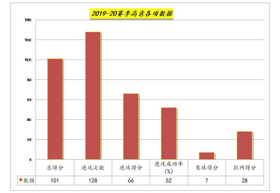 无论是进攻得分还是进攻成功率,高意都是处于劣势,得分远不如胡铭媛和杨涵玉,只比王媛媛稍占优。发球环节也只比王媛媛高,但上个赛季王媛媛的发球排名第一,这个赛季没有发挥好,而高意的发球一直以来都是比较薄弱。拦网环节处于中间位置,胡铭媛和郑益昕主要是高度劣势,而王媛媛、杨涵玉、高意的身高都在190以上,得分上不如王媛媛和杨涵玉。