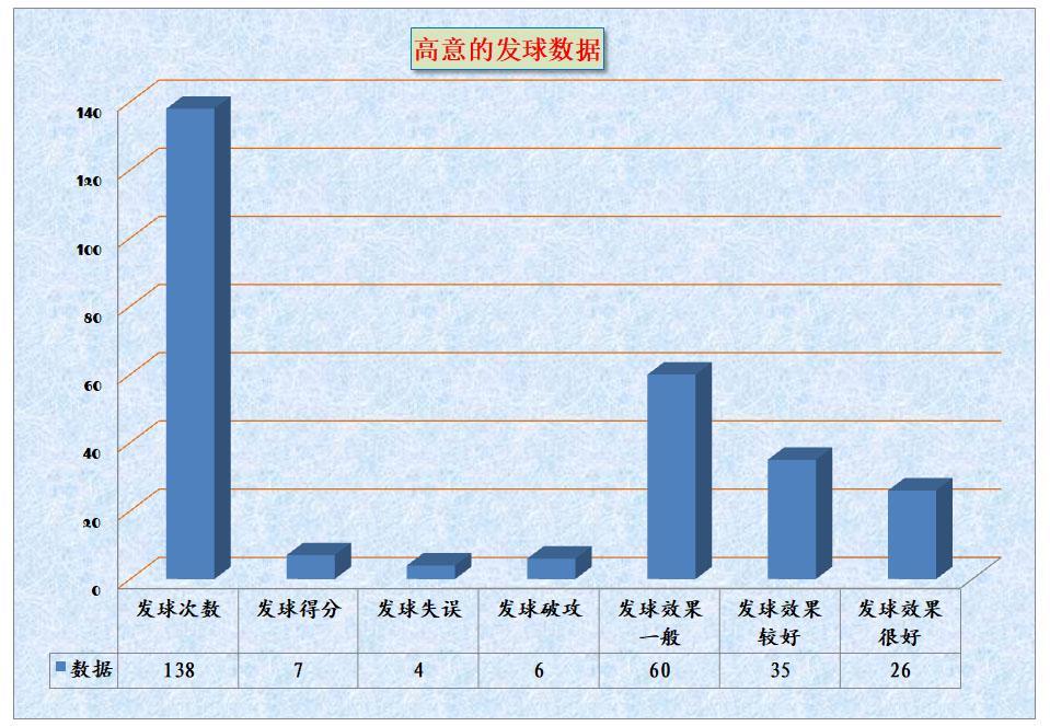 发球环节一直都是比较薄弱的,发出138个球,只得到7分,高意的发球既不是跳发也不是跳飘,而是站定举高手来发,看似发球的点比较高,但球速一般,弧度偏高,所以威力不够,冲击力弱。球速不快主要是发球时拍的瞬间没有加力,发出弧度能够确保过网口,从而降低失误率,这就为什么失误只有4分的原因,不能说是保守,而是本身高意发球习惯的方式。9场比赛看,发球上最多一场就只得2分,因为冲击力不够,能够破发对方的一传也不多,从数据看,发球效果一般几乎占了一半,所以整体看发球上平平,只能算是中规中矩,仍然也待加强。