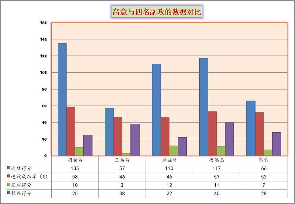 从上面的分析看出高意的发球性能比较一般,冲击力不够,有的发球没有出质量,基本就等于送分,尤其是遇到强队的比赛。中国女排近两年比较注重发球环节,目的就是要破坏对方的一传,利用发球带动拦防,所以提高发球性能也是在提高自身的竞争力。发球上要增快速度,才更有冲击力,在发球的线路相对比较单一,所以要增加长短线路的变化,增加落点、角度上的变化,比较常规的发球,性能自然就一般,所以提高发球性能,对于高意来说,最主要就是提升速度、加强变化。