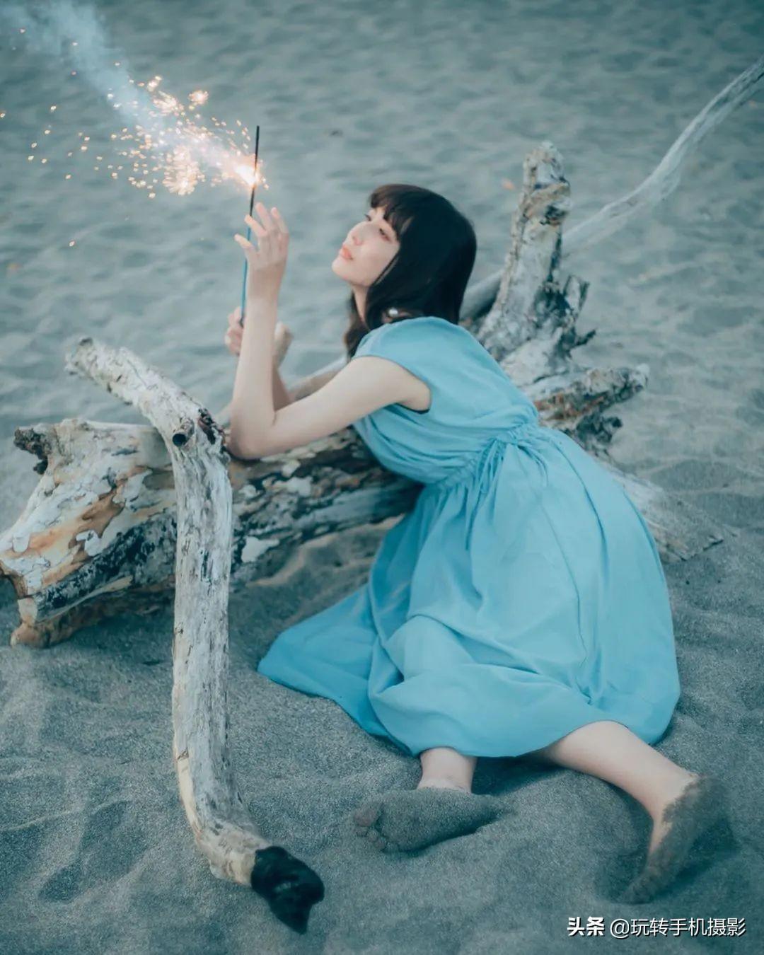 比如,这一张沙滩边的人像照,简约的沙滩背景、干枯的树干、燃烧着的烟花交代了场景的氛围,而被摄者躺着,身体形成自然的线条美感,此时整个画面唯美而略带情绪化。