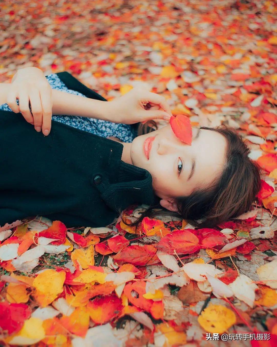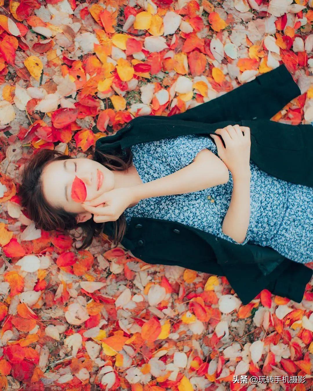 如果拍摄场景是一片绿色草坪或是被落叶覆盖的场地,可躺下来拍一拍照,适当地借助一些花或者树叶,充当遮挡物,则画面会更有意境感。