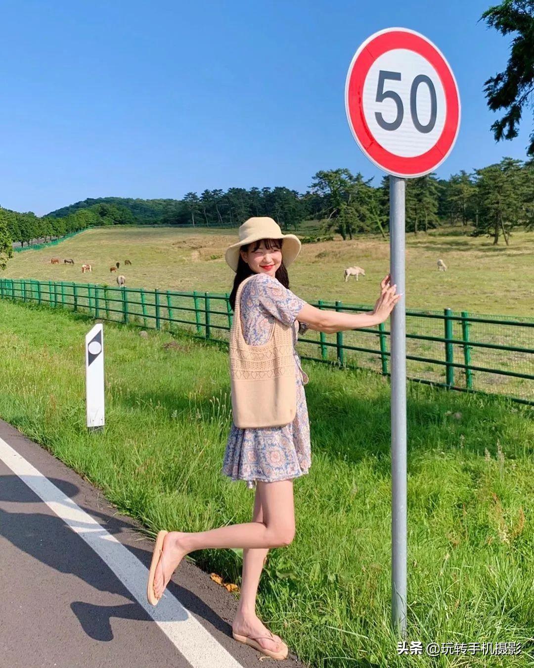 比如,当你的旅途存在一些店面招牌、道路标杆......在取好景之后,一只脚贴地面,另一只脚向一侧抬起,将手轻轻靠在支撑物上,画面看起来平稳而自然。