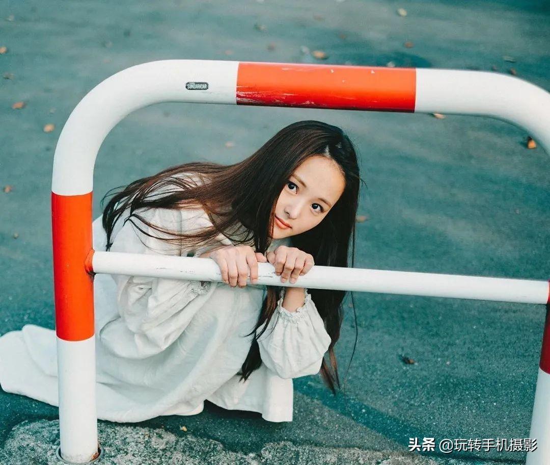 再者可以是借助周边的一些事物,像是路边的栏杆,蹲下来双手趴在栏杆上,做出探头的姿势,画面略带一丝丝的可爱风。