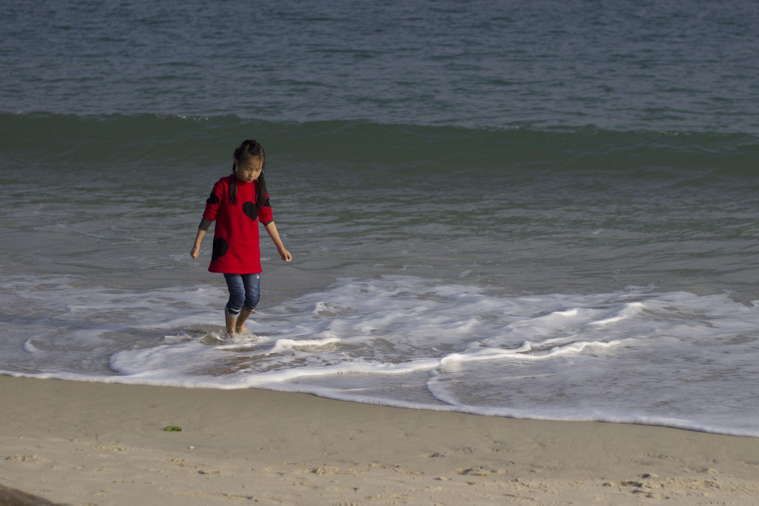 小朋友在沙滩上玩,背仔角很适合亲子游玩