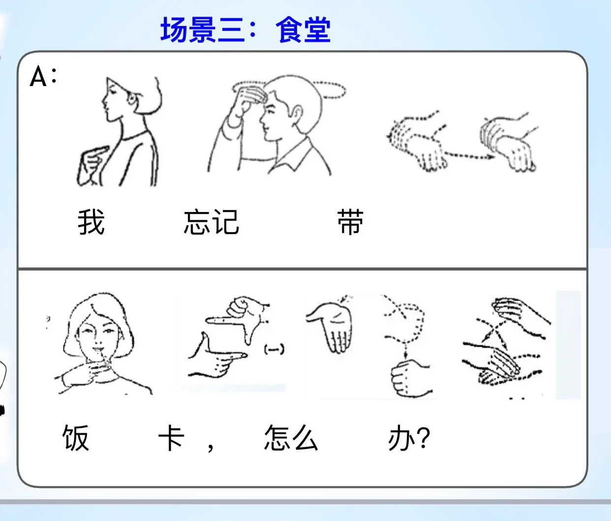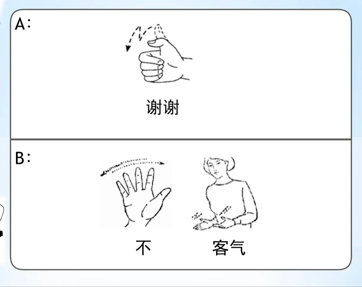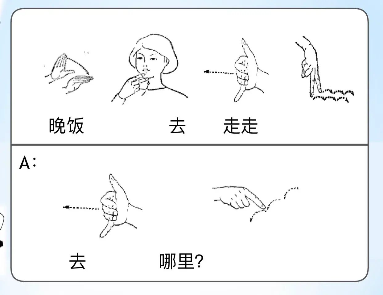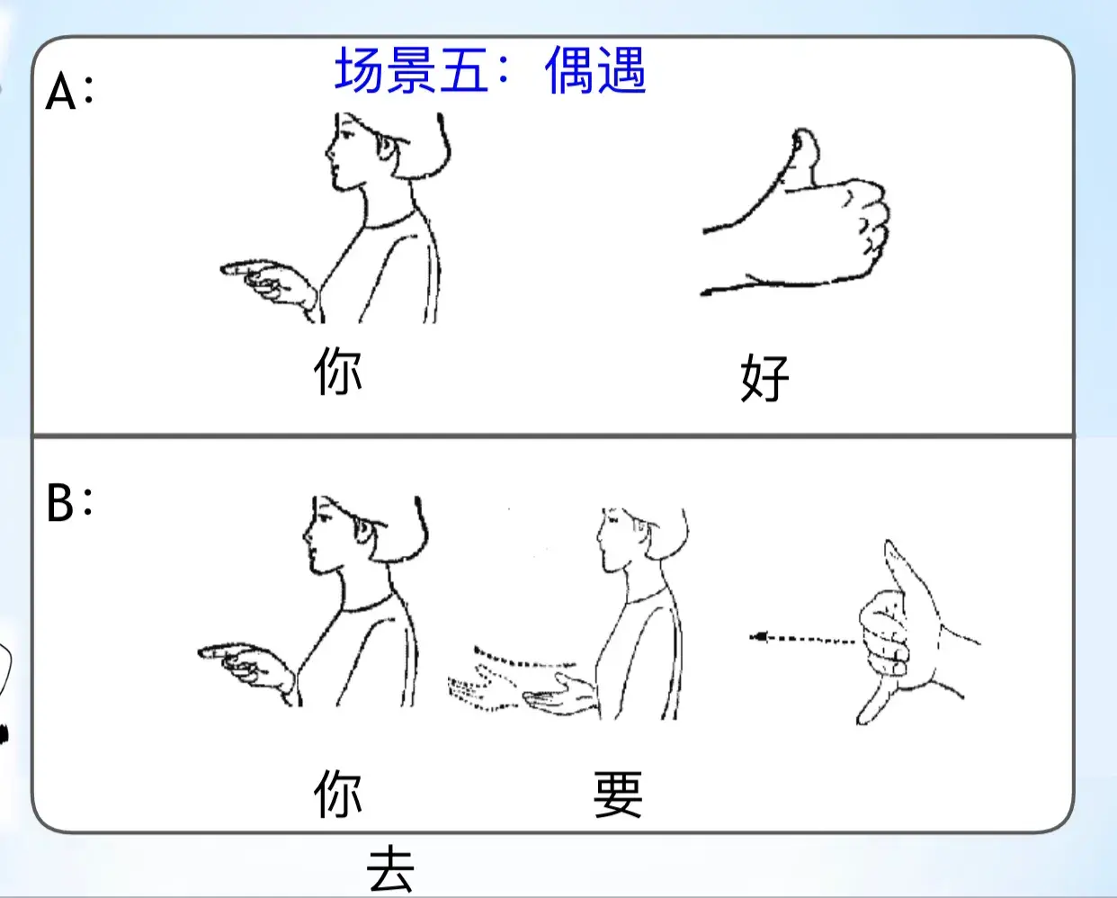 以上模拟场景进行手语对话练习,生动而有趣,可以和家人、朋友一起学习,既学会了手语,又增进了感情,何乐而不为呢!
