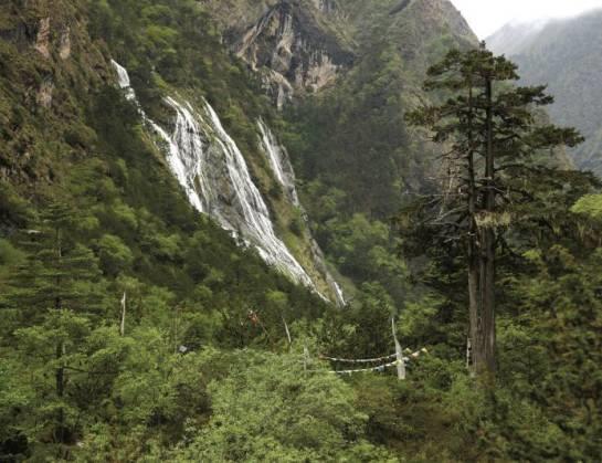 岗亭瀑布,藏语意为“天降神水”,位于麻玛乡至勒乡途中。相传,有一年藏历4月15日莲花生大师在此处酿制青稞酒,因不慎将酒桶的酒龙口露酒而形成瀑布,有佛缘者饮此瀑布水能喝出青稞酒的味道。在瀑布上层有自然形成的酿制青稞酒的酒桶。