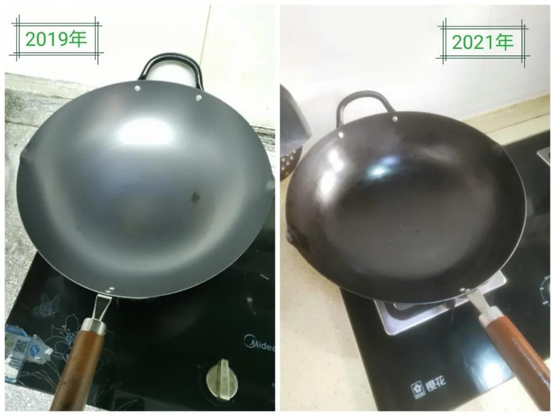 铁锅刚买来都是左图这个样子,使用后锅体就会成为右边这样,肉眼可见的变黑。