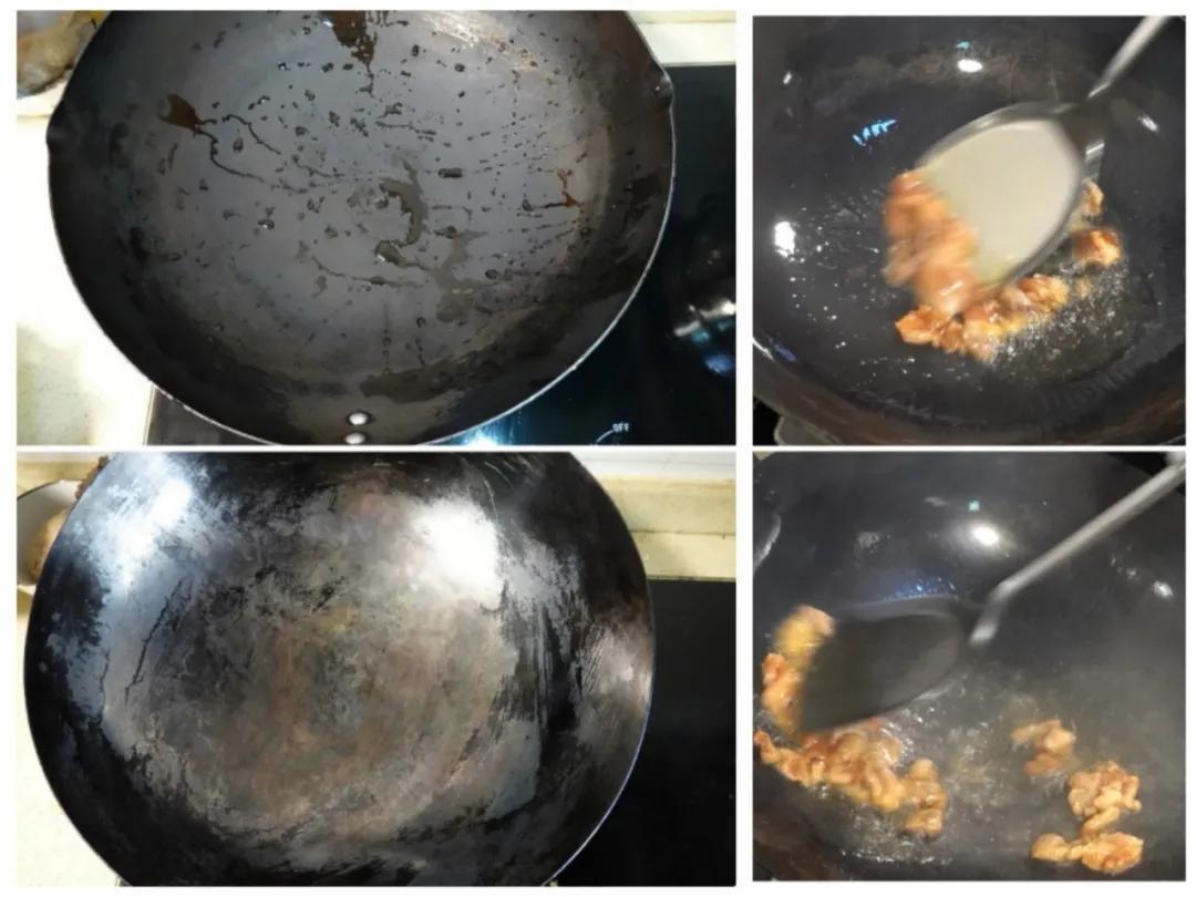 为了让大家感受一下这种区别,我做了一个残忍的海绵擦刷锅实验:以上两口锅炒完肉后分别用洗洁精+糙布使劲刷,出来是这个样子的。(小锅锅对不起这波结束我就来好好养你......)