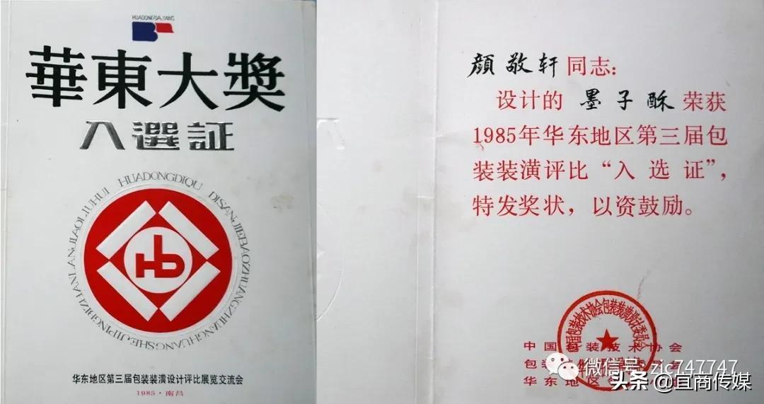 (1980年代的麦陇香墨子酥包装盒设计者是颜敬轩,这款设计获1985年华东地区第三届包装装潢评比“入选证”)