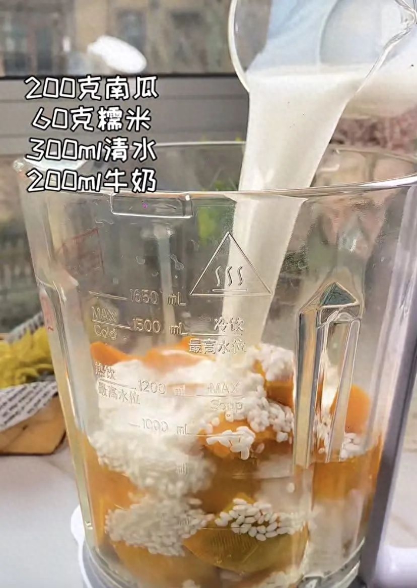 ②将200克的南瓜,60克的糯米,300毫升清水和200毫升牛奶放入破壁机中,选择”豆浆“模式。