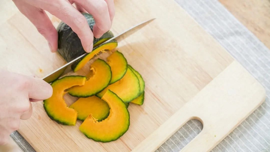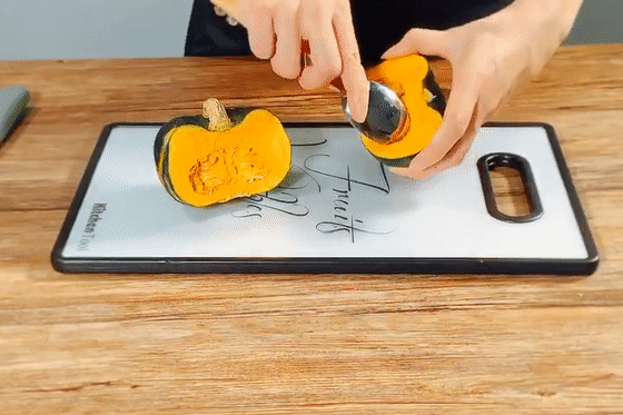 ①把贝贝南瓜洗净切半,挖出其中的籽。取一半,切成薄片。