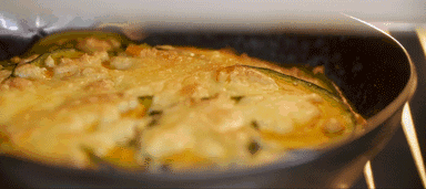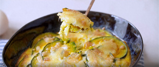 Tips:没有烤箱也可以用平底锅代替。在锅内刷入一层薄油,加入食材后小火烙约6~8分钟,稍微凝固后加入奶酪碎,加盖小火焖至奶酪碎融化,蛋奶液彻底凝固即可。