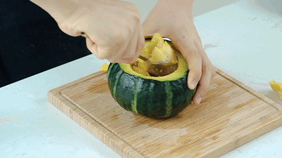 ③用勺子把贝贝南瓜中间去籽后,掏出南瓜肉备用。