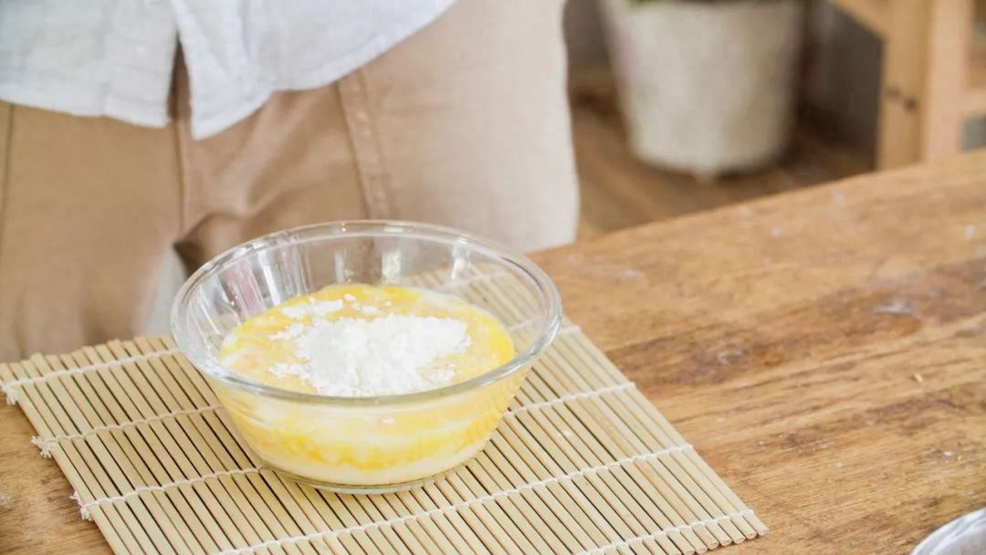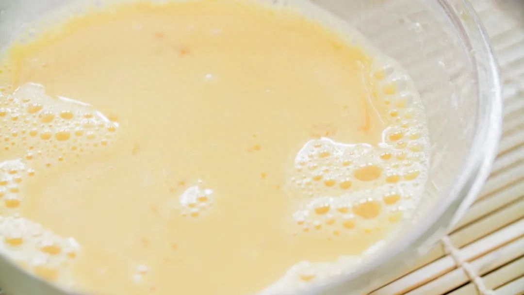 ②2个鸡蛋打散,在蛋液中加入120g牛奶,15g玉米淀粉和5g细砂糖。