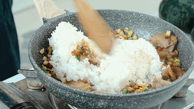③锅内倒入五花肉,翻炒至熟,倒入香菇粒炒匀,再倒入第2步焯好的玉米粒、胡萝卜粒、豌豆粒,翻炒片刻,加入沙茶酱、蚝油,翻炒均匀。再倒入煮好的米饭,把米饭炒散