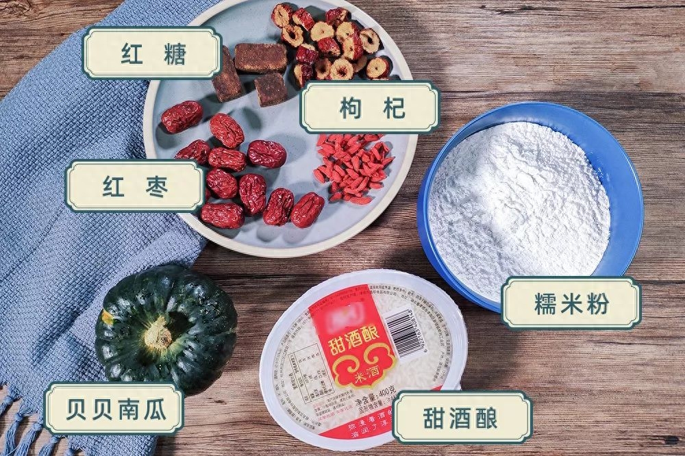 糯米粉100g / 贝贝南瓜100g / 甜酒酿3勺 / 红糖2块 / 枸杞红枣适量