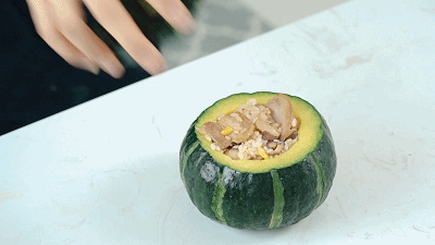 ①南瓜切掉顶部的头盖儿,用勺子挖掉中间部分的南瓜肉,放一旁备用
