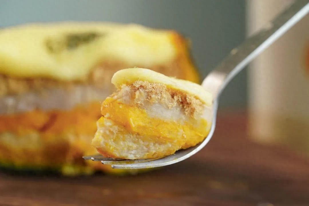 蛋糕里吃出了五层口感:燕麦酥软、南瓜泥很香浓、芋泥像奶油般细腻、顶层还有肉松和马苏里拉奶酪。简直太美味了~