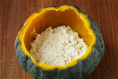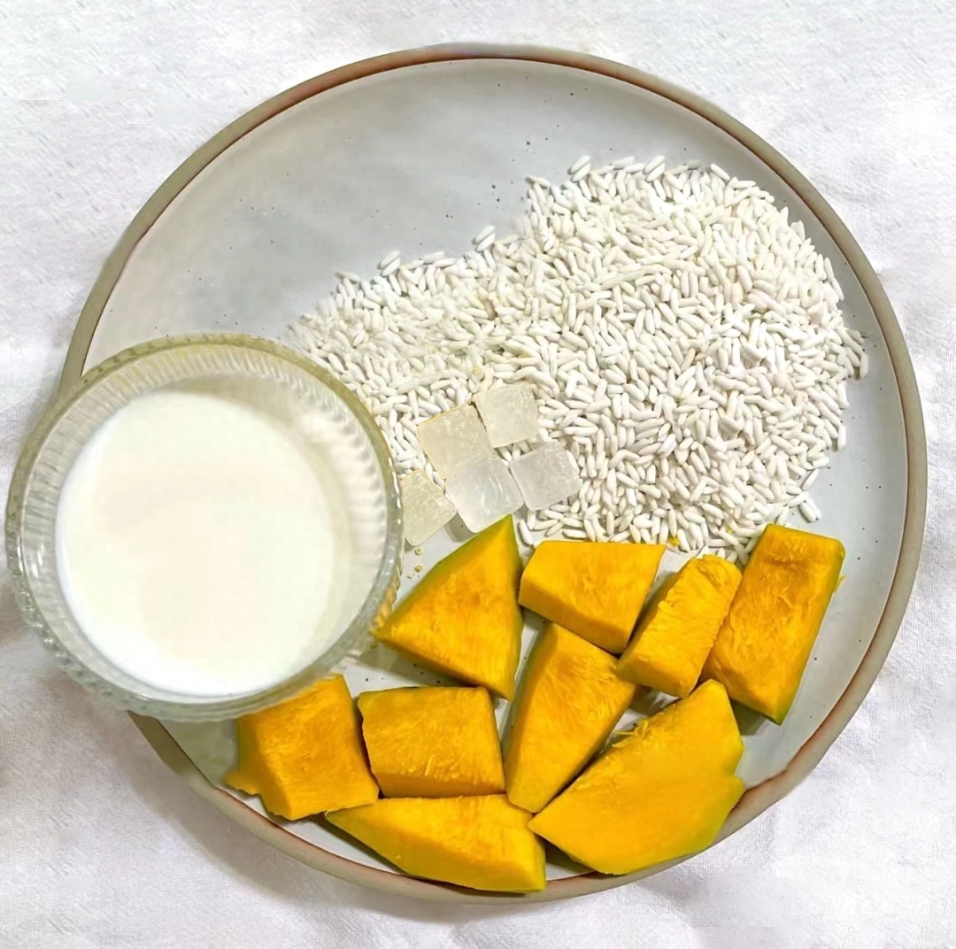 贝贝南瓜200克 / 糯米60克 / 牛奶200毫升 / 冰糖适量