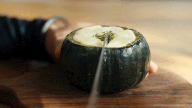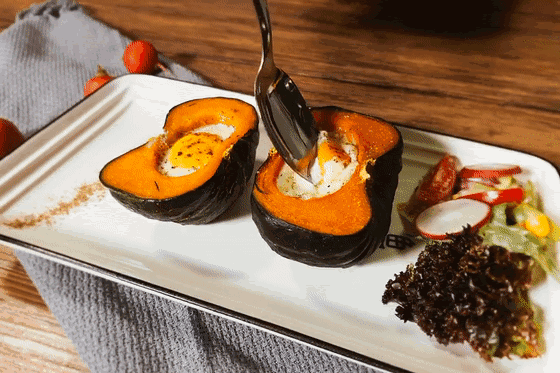 成品的贝贝南瓜窝蛋颜值超高。舀上一勺,微微的流心配着软糯香甜的南瓜肉,简直美味!