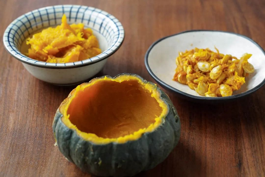 ①南瓜洗净,切开头部(不要扔),挖去囊。