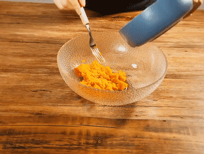 ④将南瓜泥和2个熟咸蛋黄用叉子捣碎,混合备用。