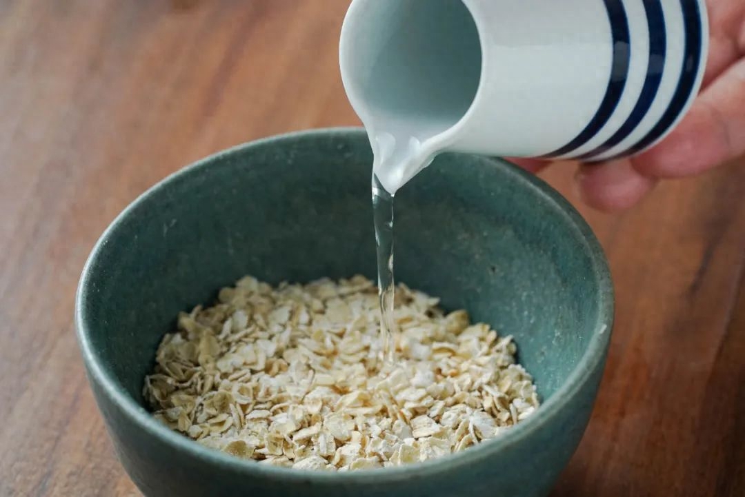 ①将3勺燕麦放入碗中,加适量热水冲泡15分钟,备用。
