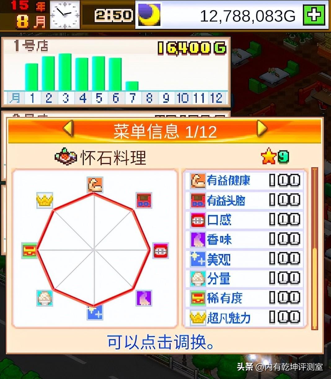 怀石料理一出,其实美食梦物语这款作品就等于是结束了,因为每个店铺最少可以设置一款食物,G哥的三个店只摆怀石料理,金币获取已经不是问题;在开发完怀石料理后,再开发其他食物也没了什么兴致,最主要的问题还是在于没有新的游戏内容。