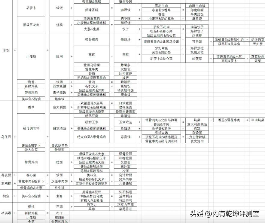 接下来才是菜谱开发,在标题中G哥已经提到了,没玩过的可随意发展,出怀石料理就够了,那么前期不管大家开发什么食物都可以,随着自己的心情玩。而极限流玩家通常会采用烤鸡肉串开局,因为前期通过强化可以将价格抬到53,可以满足游戏中的大部分金币需求,毕竟金币还有招募员工、购买原料等需求,如果金币不足就慢慢玩,或者多看看广告,这里需要附上玩家“拜金长”制作的菜谱开发流程,看起来非常清晰。